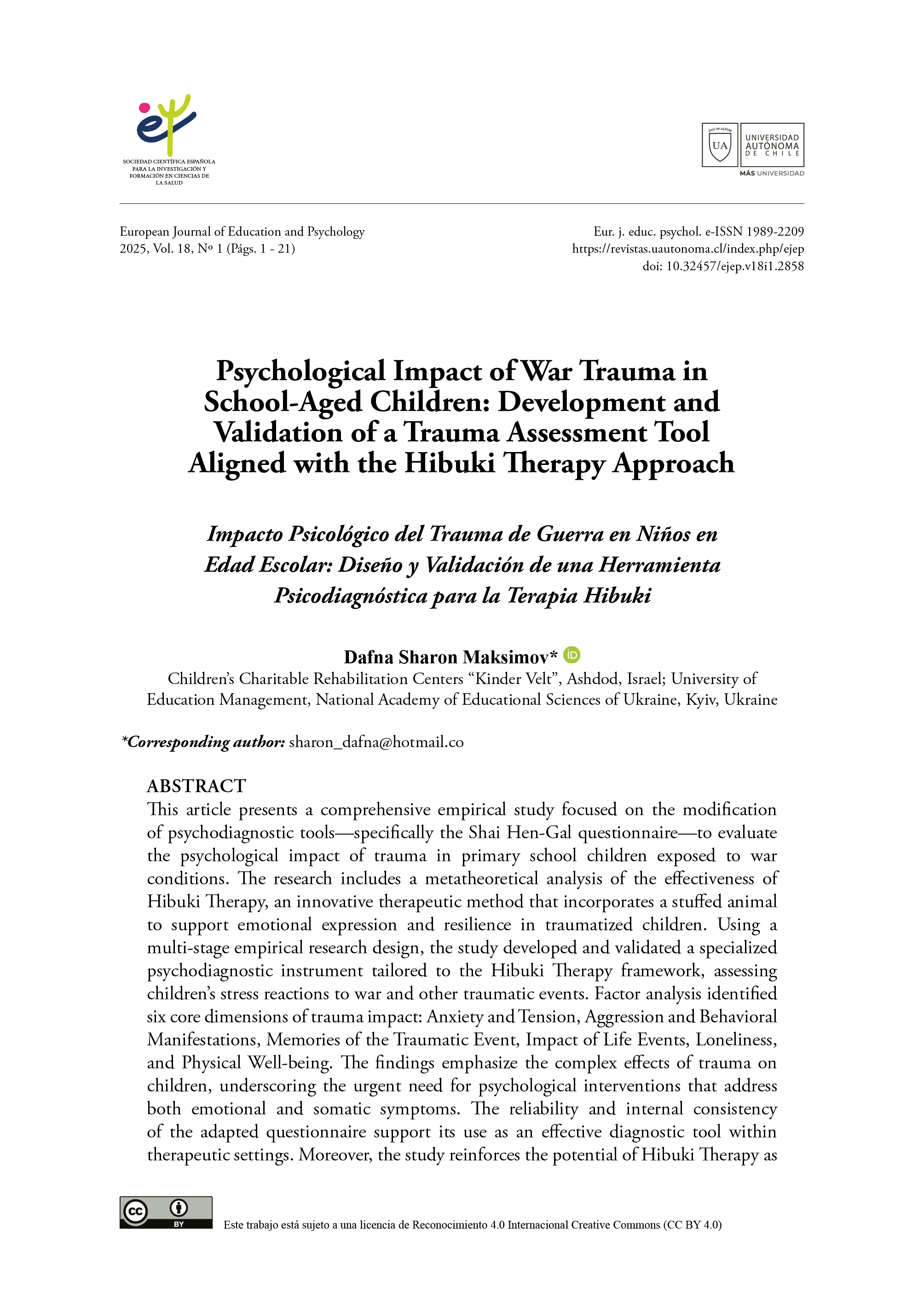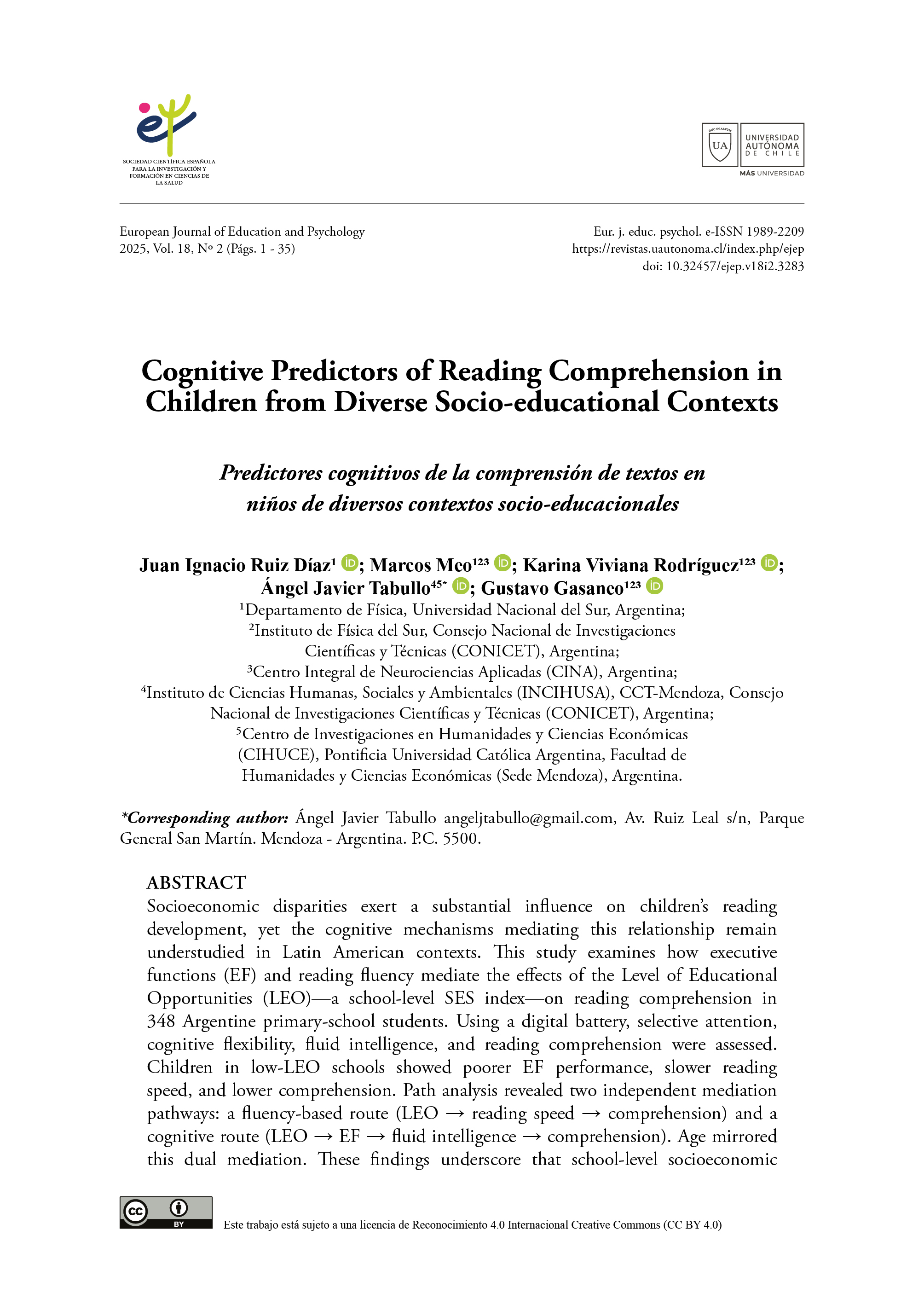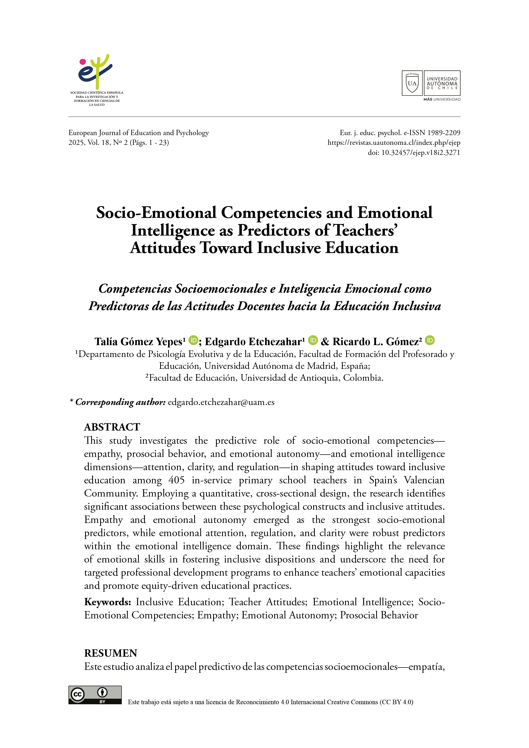La European Journal of Education and Psychology (EJEP) e-ISSN: 1989-2209, se encarga de publicar diferentes trabajos relacionados con la Educación y la Psicología, en su vertiente más amplia, extendiendo su cobertura a profesionales de otras disciplinas afines. La European Journal of Education and Psychology (EJEP), es una revista seriada revisada por pares, de periodicidad semestral. Tiene un alcance internacional y foco en Iberoamérica, es de acceso abierto y utiliza una licencia Creative Commons de Reconocimiento  4.0 Internacional (CC BY 4.0 ) desde enero de 2025. Los contenidos están disponibles en acceso abierto inmediatamente después de su publicación.