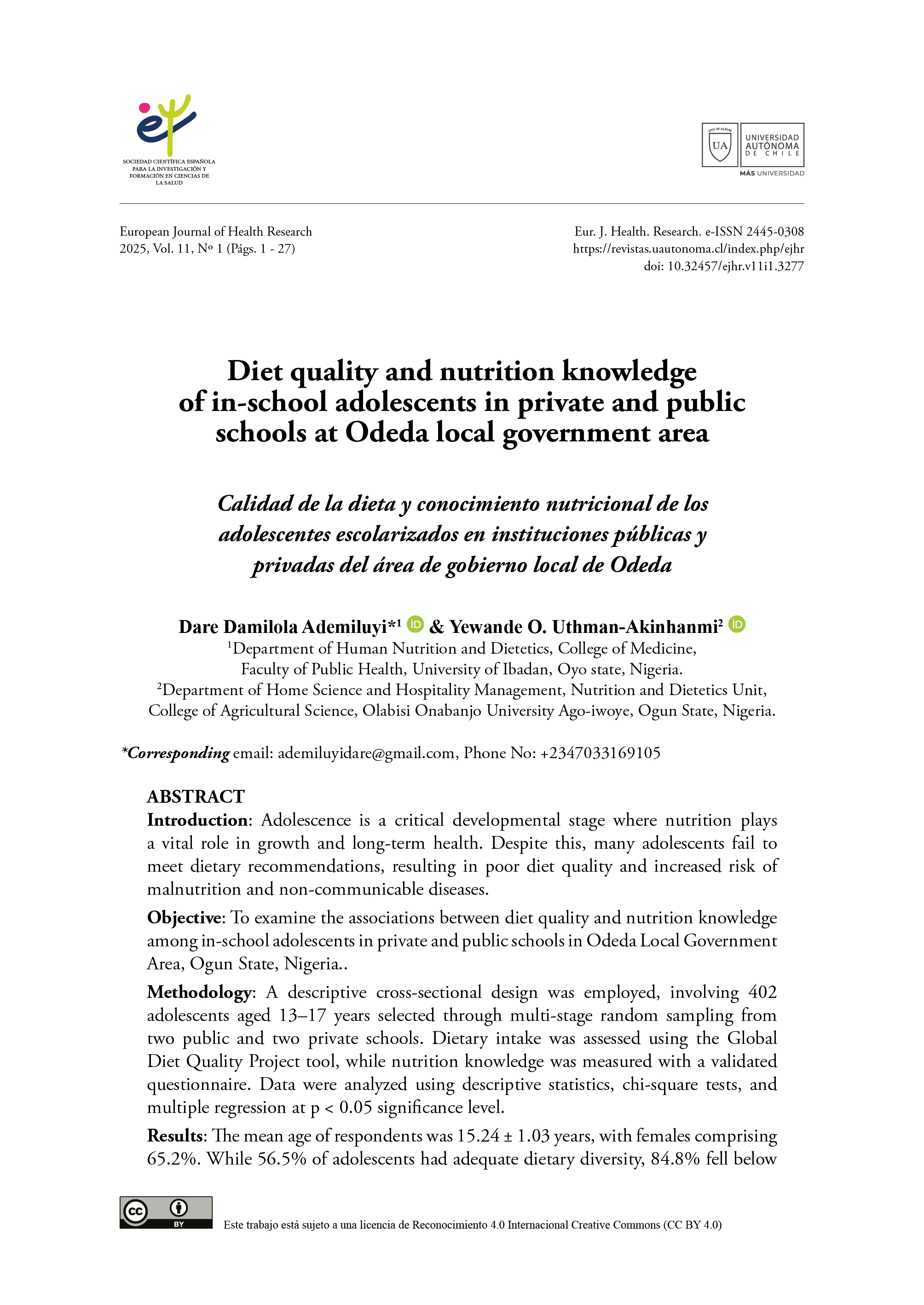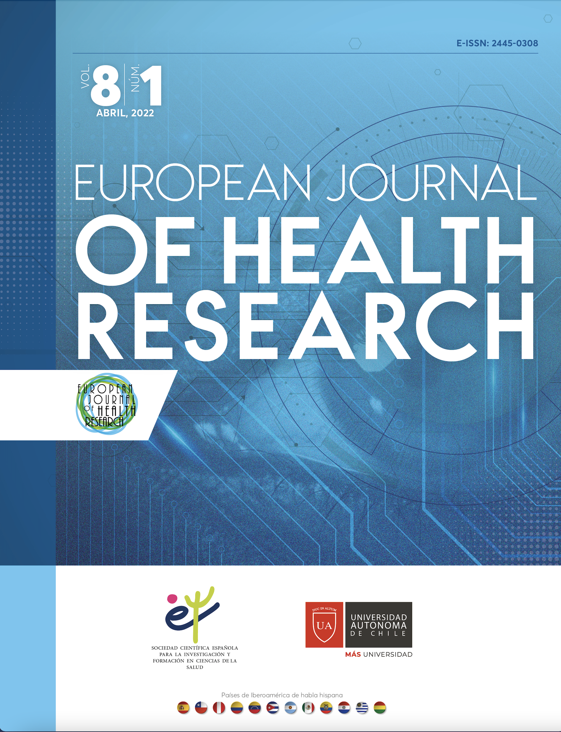The European Journal of Health Research (EJHR), e-ISSN: 2445-0308, was created in 2015 by the Spanish Scientific Society for Research and Training in Health Sciences (ASUNIVEP) and since its creation it has been oriented to disseminate research in health sciences, carried out in Latin America in close collaboration with the Universidad Autónoma de Chile. As of 2021 the journal is edited in Santiago de Chile by the Universidad Autónoma de Chile, in this way the EJHR journal becomes the official organ of its Faculty of Health Sciences and of the Spanish Scientific Society for Research and Training in Health Sciences (ASUNIVEP). Your e-ISSN registration: 2445-0308 was transferred to the ISNN Chile agency (https://portal.issn.org/resource/ISSN/2445-0308#)