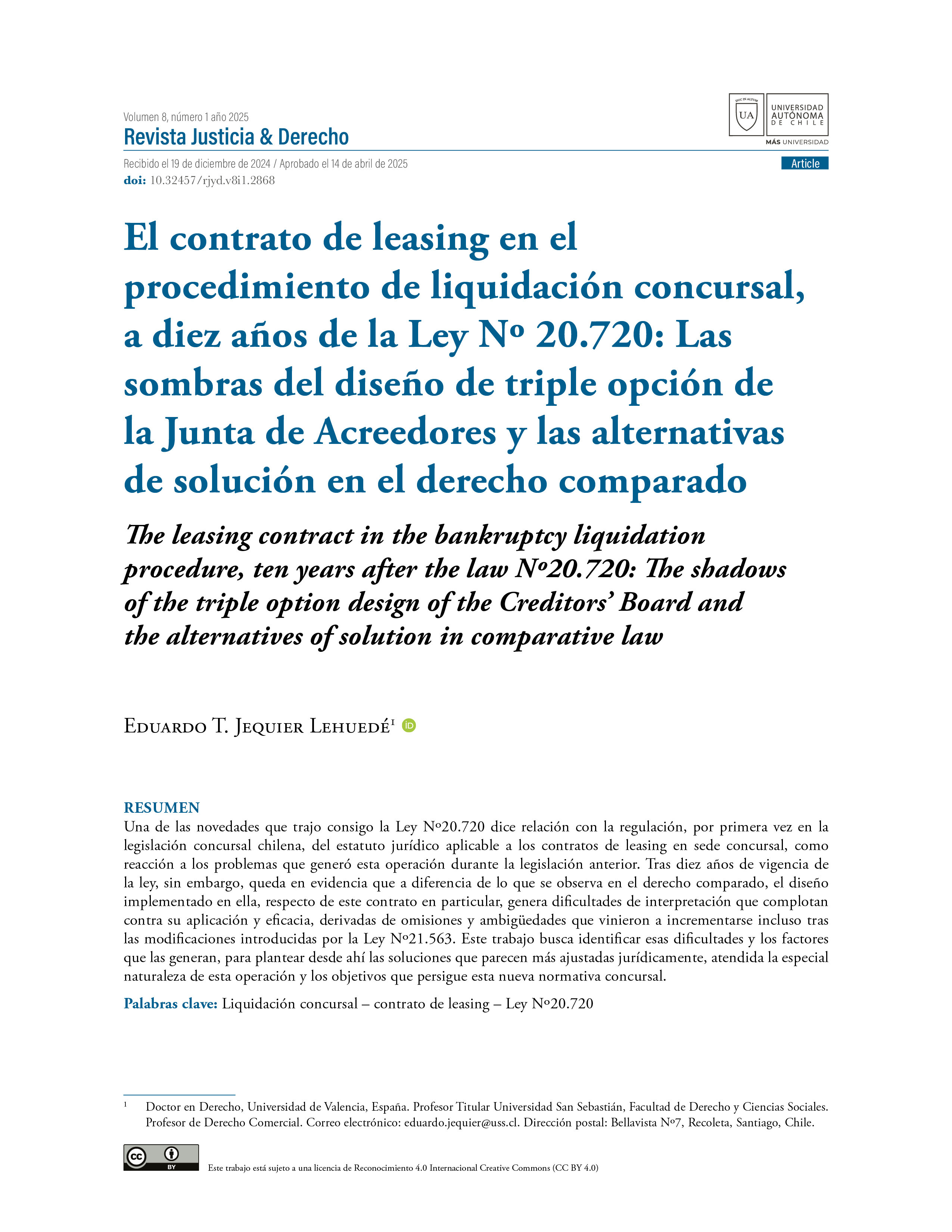La Revista Justicia & Derecho es una publicación seriada que tiene una periodicidad continua y es sometida a evaluación de pares externos a través del método doble ciego. Pertenece a la Vicerrectoría de Investigación y Doctorados de la Universidad Autónoma de Chile y cuya guarda científica corresponde al Instituto de Investigación en Derecho de la Facultad de Derecho de la casa de estudios.