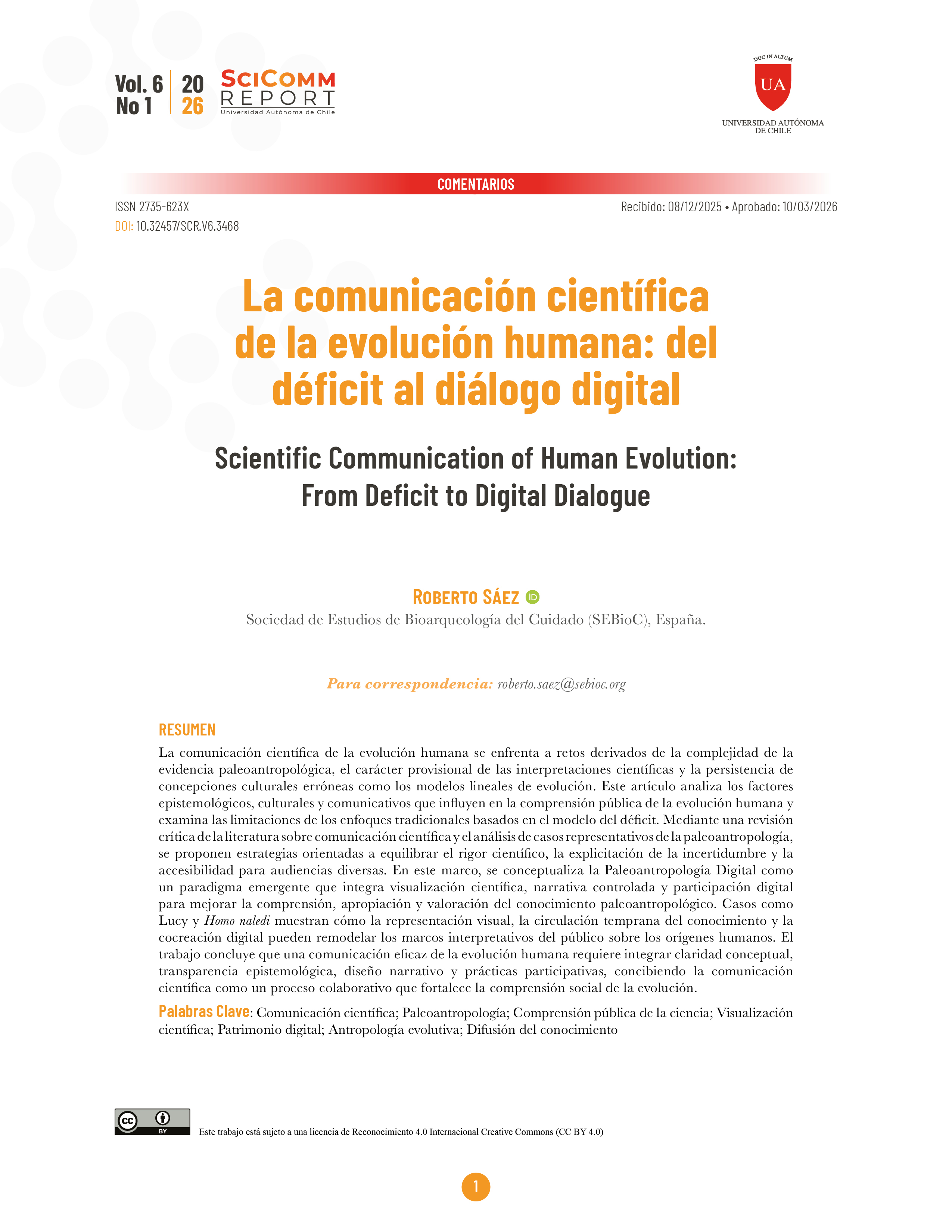SciComm rep., no demanda cargos por procesamiento de artículos (APC) ni cargos por envío de artículos para ninguno de los procesos editoriales o la publicación.